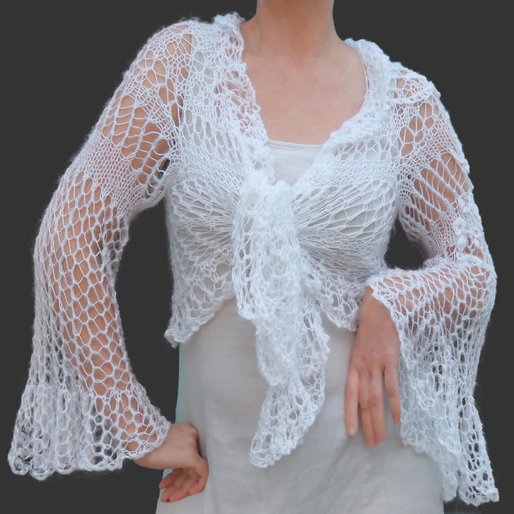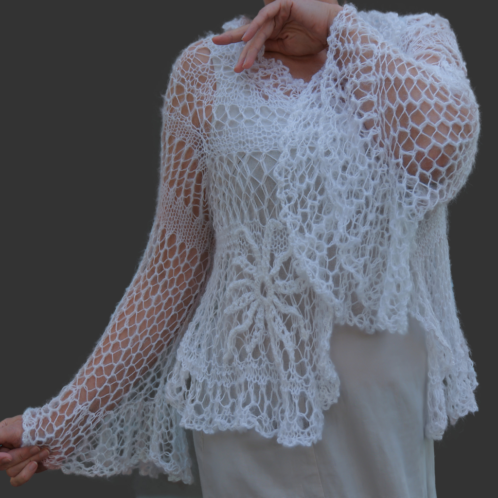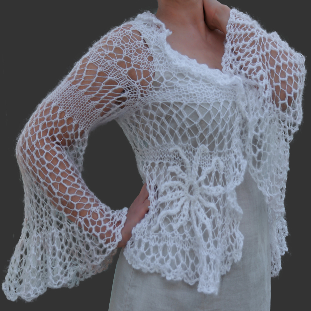 Valkoinen Korento on Korentosarjan aloittanut neuleeni. Sen näyttävät, laajat hihat röyhelöineen ja kirjailut helmassa sekä toisessa hihassa tekevät siitä mainion lisän vaikkapa morsiuspukuun! Väljä malli sopii kauniisti monenlaisille vartalotyypeille.
