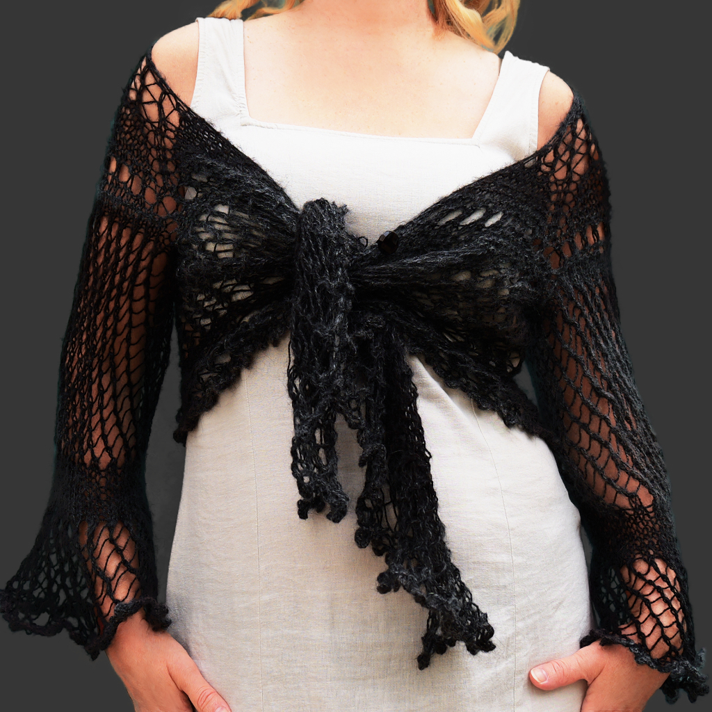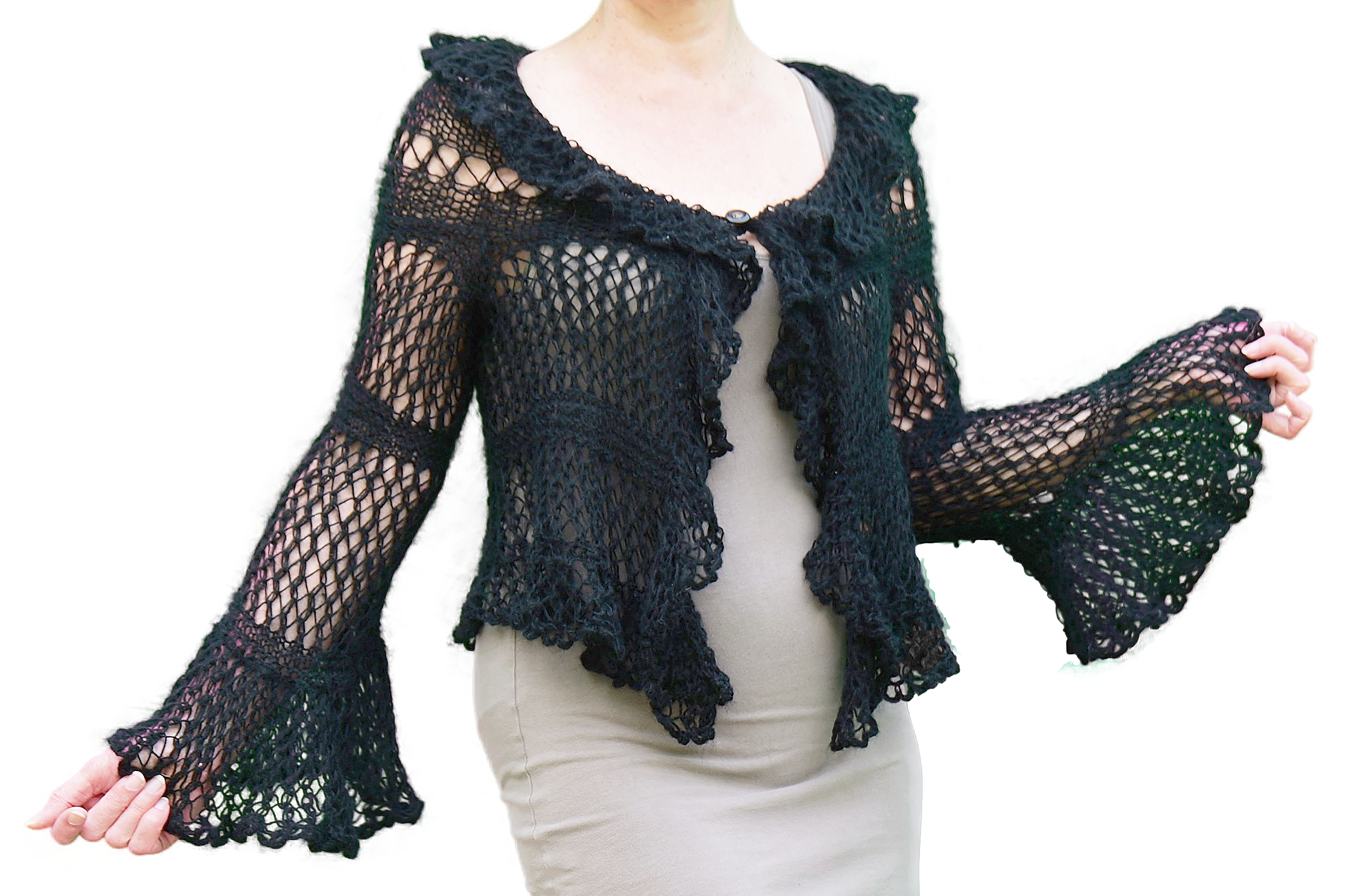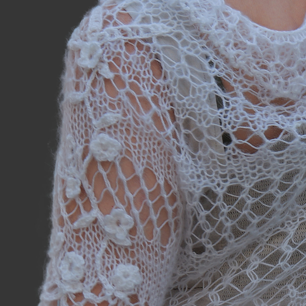 Valkoinen Korento on Korentosarjan aloittanut neuleeni. Sen näyttävät, laajat hihat röyhelöineen ja kirjailut helmassa sekä toisessa hihassa tekevät siitä mainion lisän vaikkapa morsiuspukuun! Väljä malli sopii kauniisti monenlaisille vartalotyypeille.