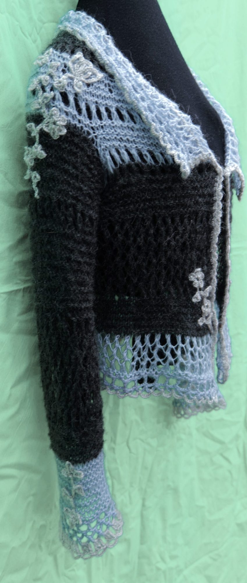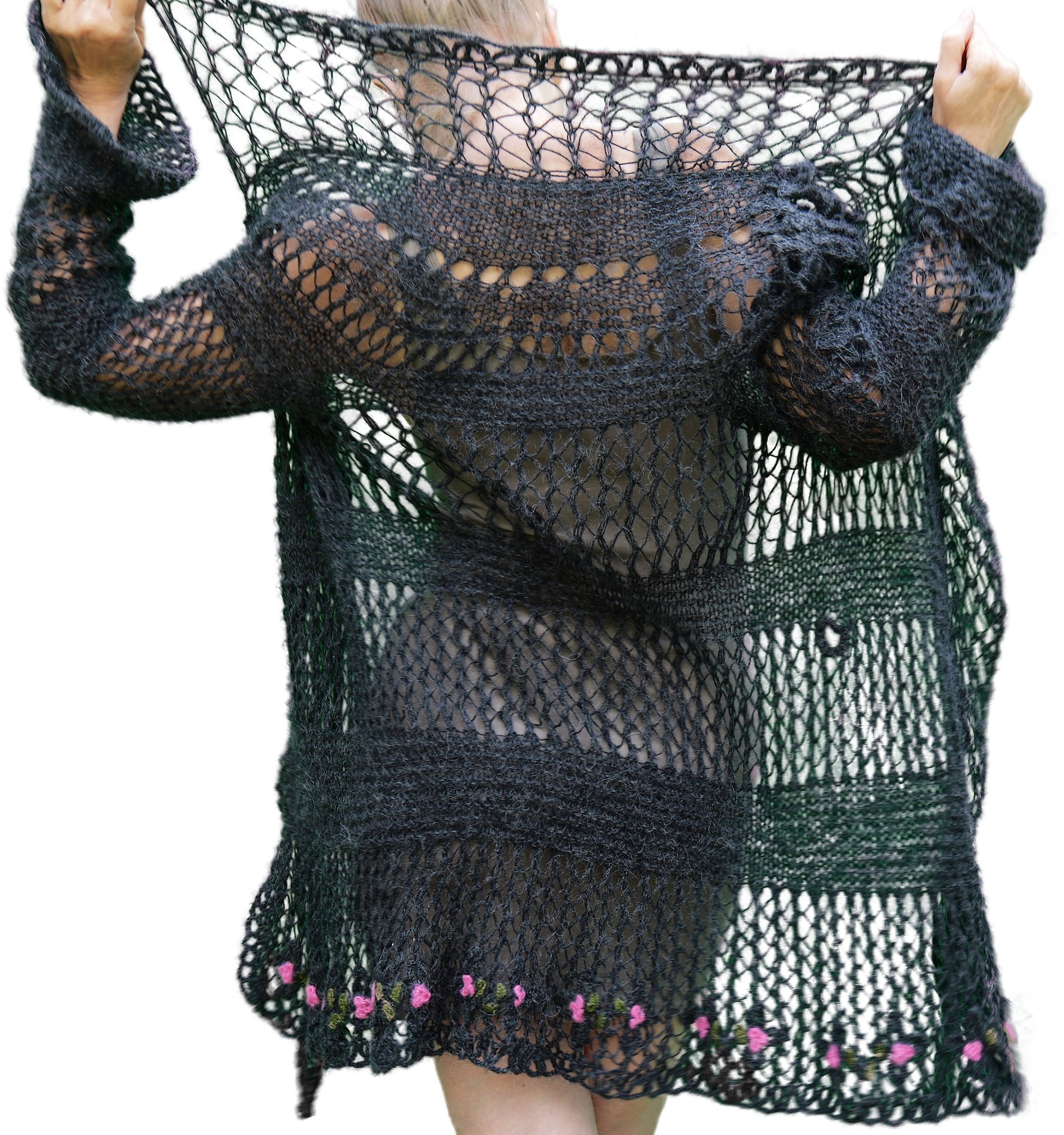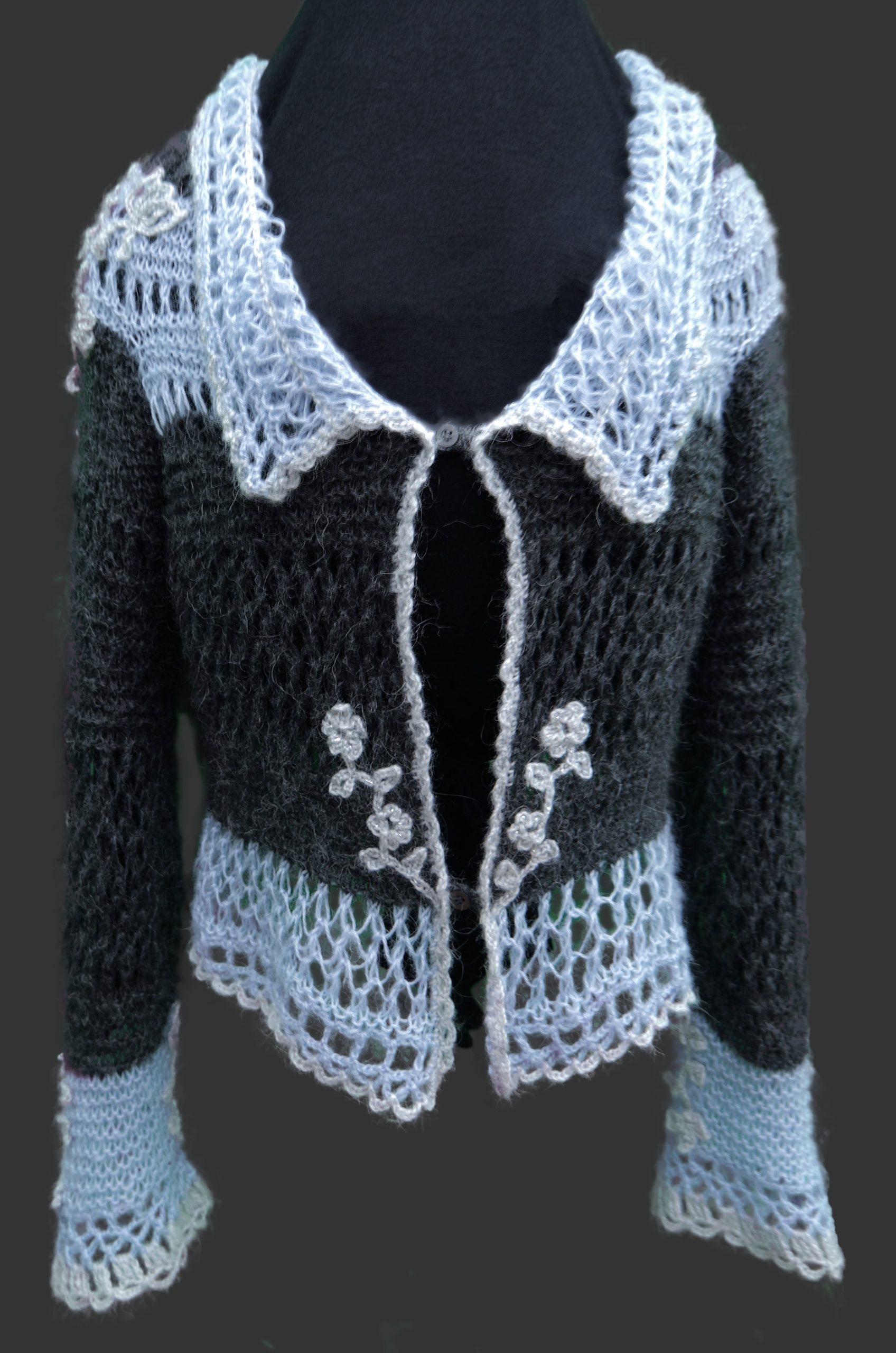 Tummanharmaa, vaaleansininen ja vaaleanharmaa yhdistyvät tässä neuleessa usvansävyiseksi kokonaisuudeksi. Hopealangan kimallus kukkakirjailuissa tuo kevyttä juhlallisuutta malliin.