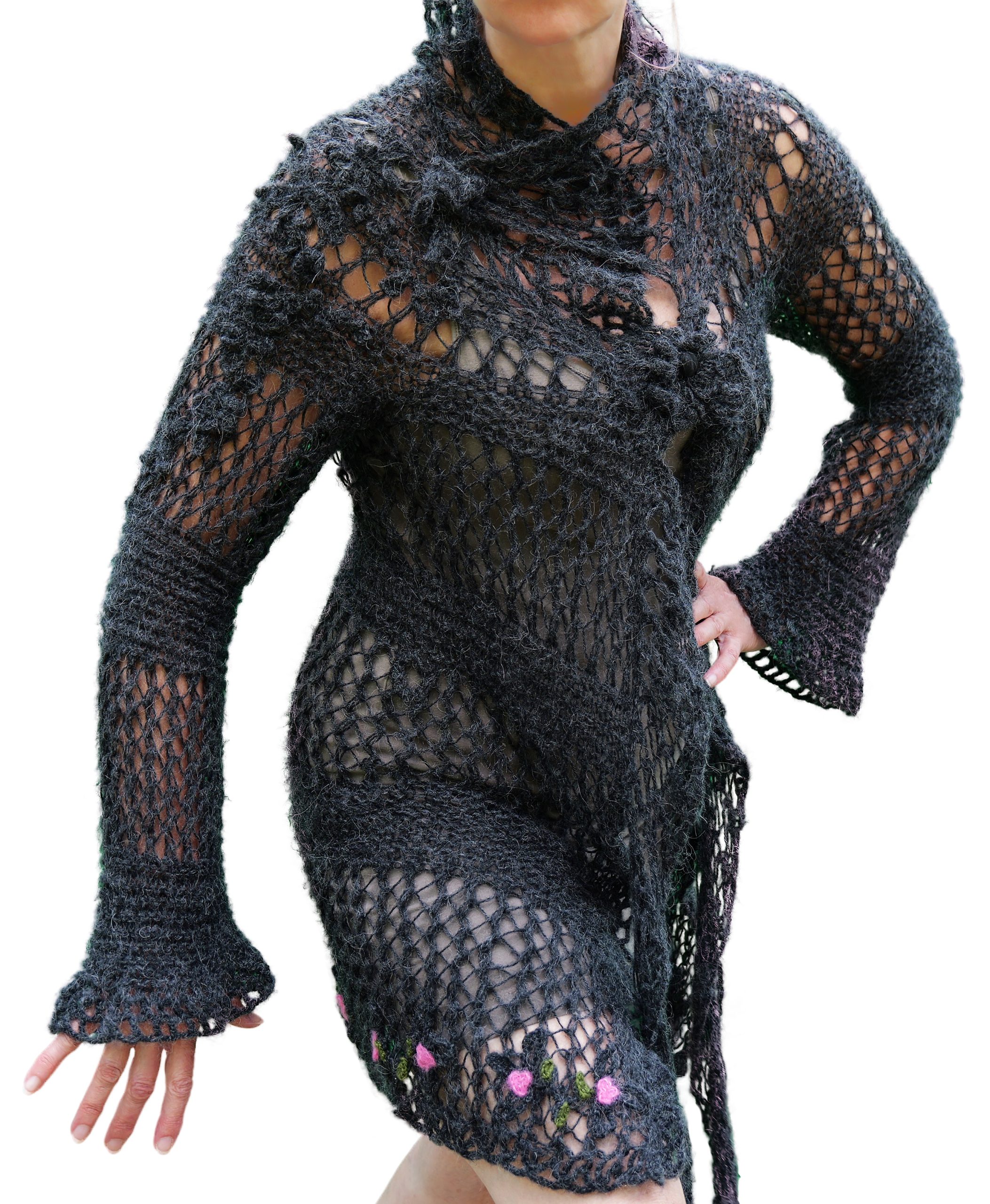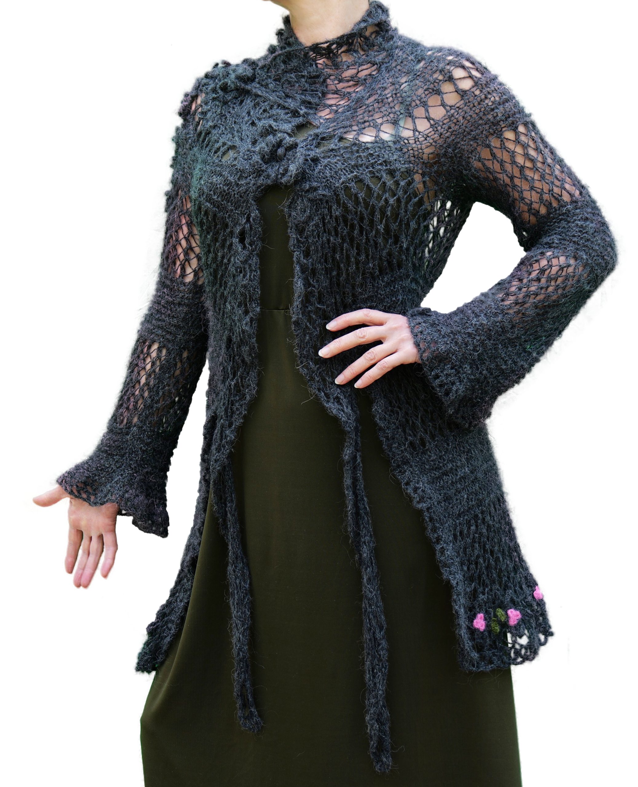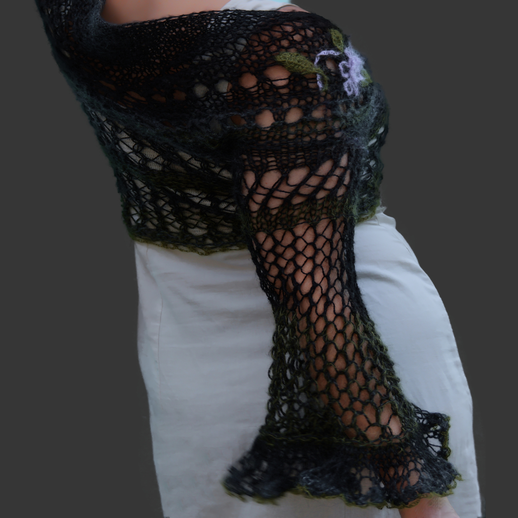 Tummanharmaa, vaaleansininen ja vaaleanharmaa yhdistyvät tässä neuleessa usvansävyiseksi kokonaisuudeksi. Hopealangan kimallus kukkakirjailuissa tuo kevyttä juhlallisuutta malliin.