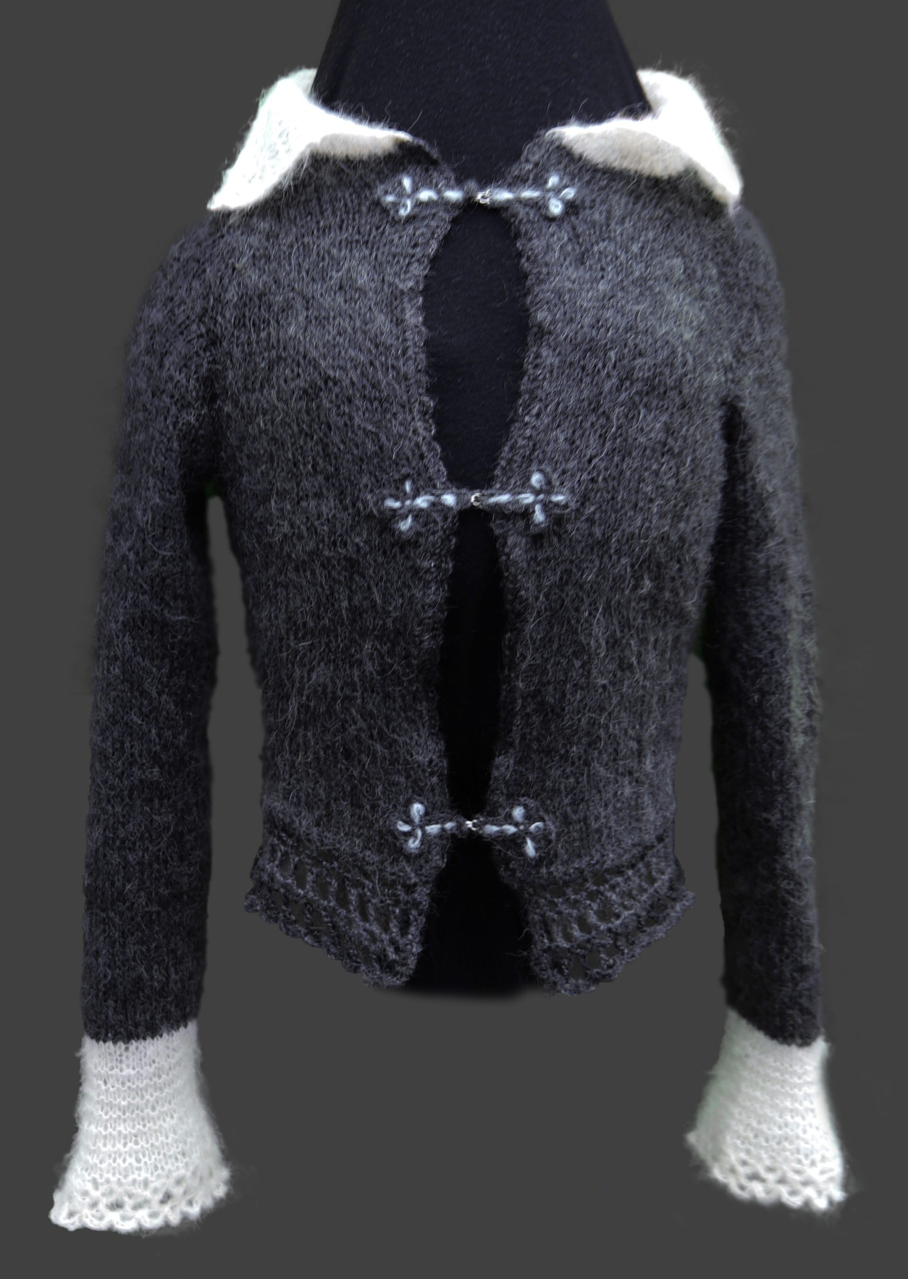 Harmaa osa on mohairsekoitetta, luonnonvalkoiset kaulus ja hihansuut taasen alpakkasilkkiä, mikä tuntuu erityisen pehmoiselta eikä kutita herkkää ihoa.