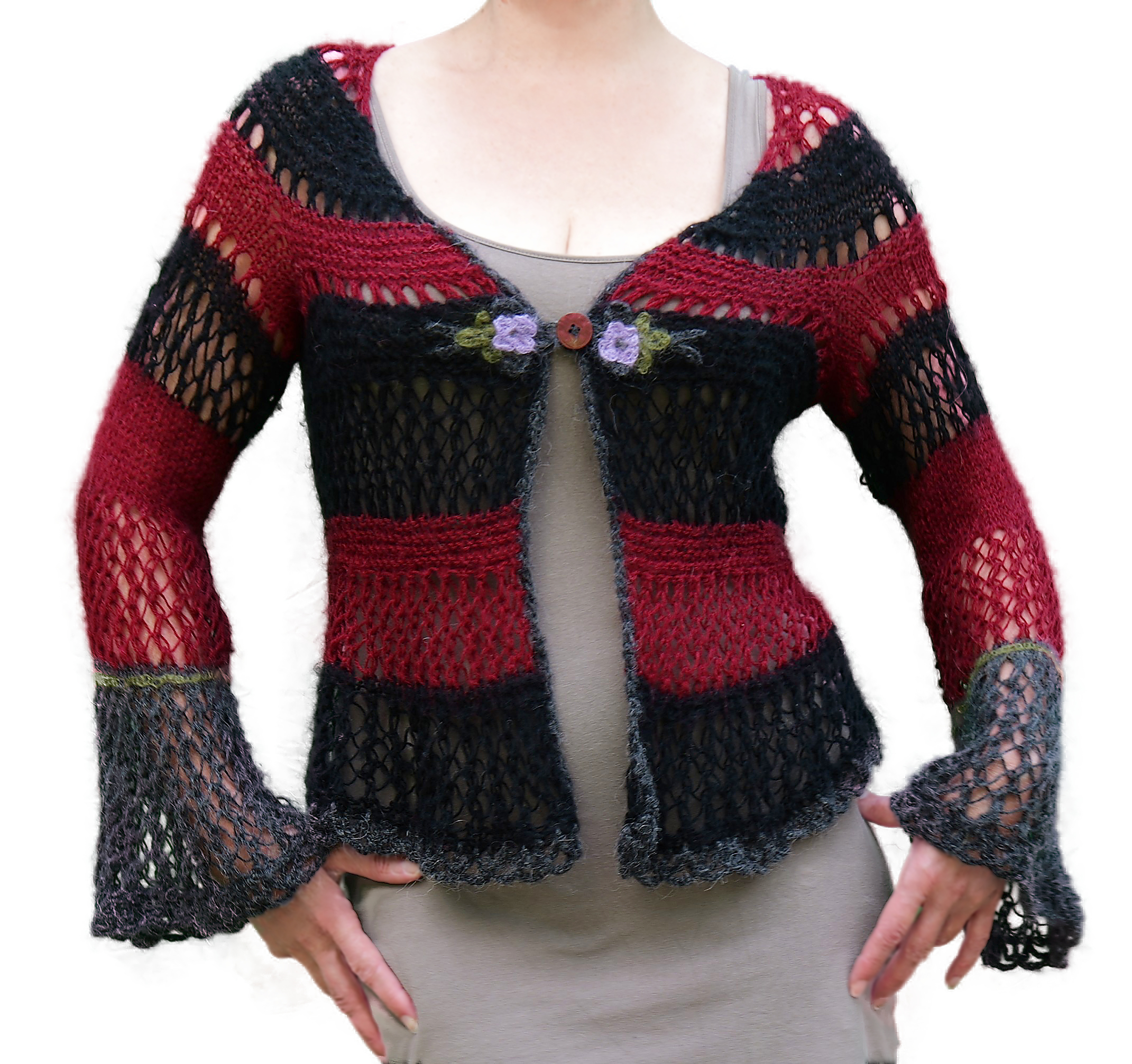 Sudenkorentoon sain idean Lontoossa, käytyäni Camden Townissa, missä edesmennyt Amy Winehouse eli ja vaikutti. Amyn hiukset inspiroivat tämän neuleen värit. Väreissä mustaan yhdistyy sammaleenvihreä, sininen tai violetti mikä toistuu helmassa ja raidoissa. Olkapäällä on kukkakirjailu efektivärein. Efektiväri toistuu myös koristenapissa.